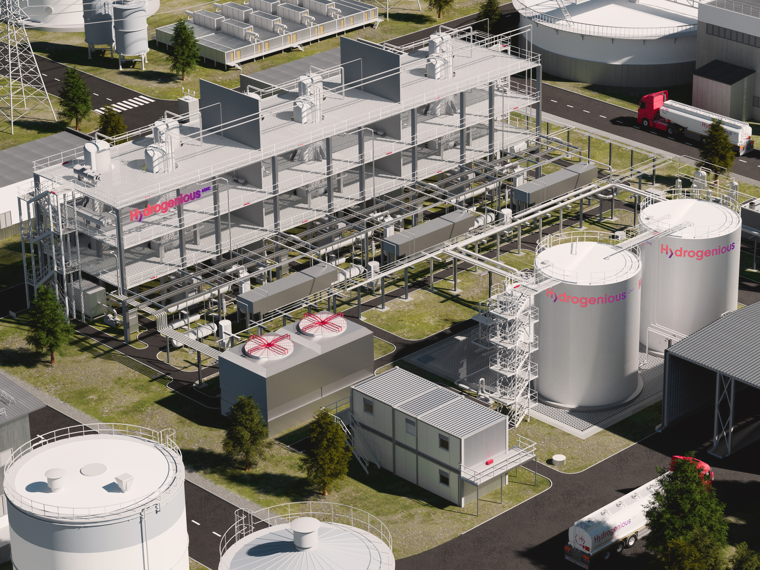 Get the latest visuals and plant renderings of Green Hydrogen @ Blue Danube (© Hydrogenious LOHC Technologies)